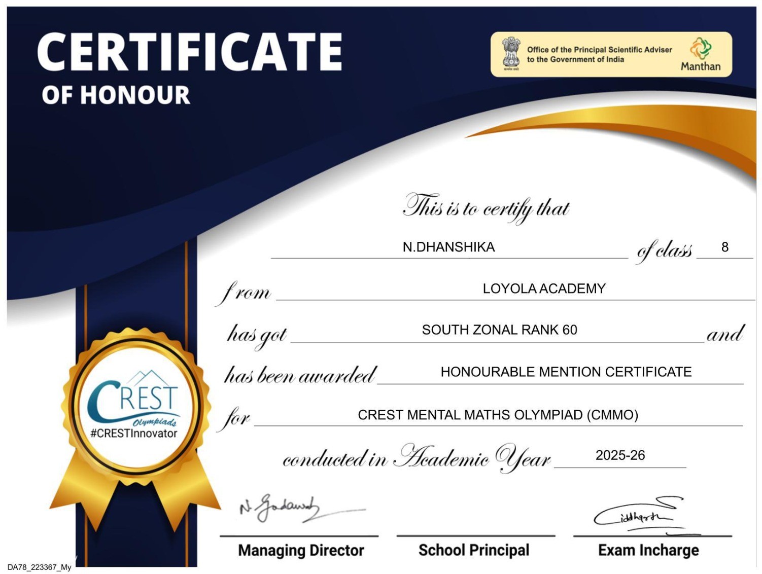HONOURABLE MENTION CERTIFICATE